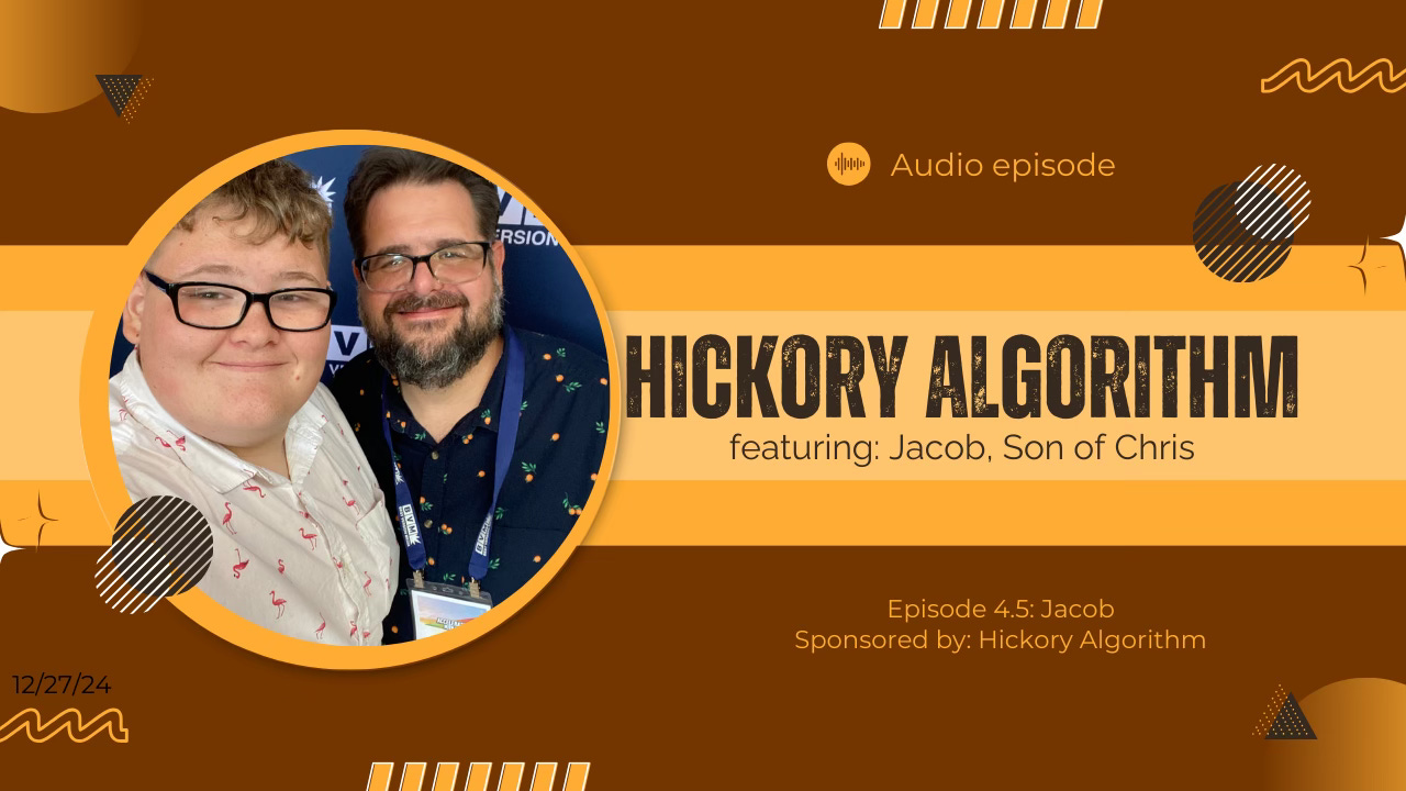 My oldest son Jacob comes on the pod this week to ask his father some questions. Jake, brings with him a vast amount of questions to ask his father. The conversations talk about proud moments, goals, and questions that he himself may have about the Hickory Algorithm. Click the link above to hear.