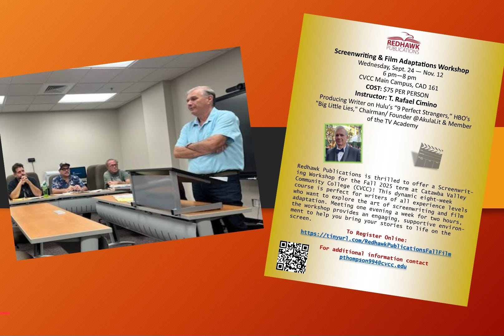 A few weeks ago, I was sitting in the green room at WHKY, about to head out to meet a client early. Just as I grabbed my bag, the buzzer on my desk phone rang. Someone was at the front door. I walked down, let him in, and we started making small talk as I showed him to the green room. He mentioned he wasn’t feeling great—he had just gotten back from Los Angeles. Turns out, I was chatting with T. Rafael Cimino, a writer from Akula Inc. who had just returned from the Emmys. He was there to talk about his new “Writing for Film and Television” class at CVCC with Chuck Boozer.