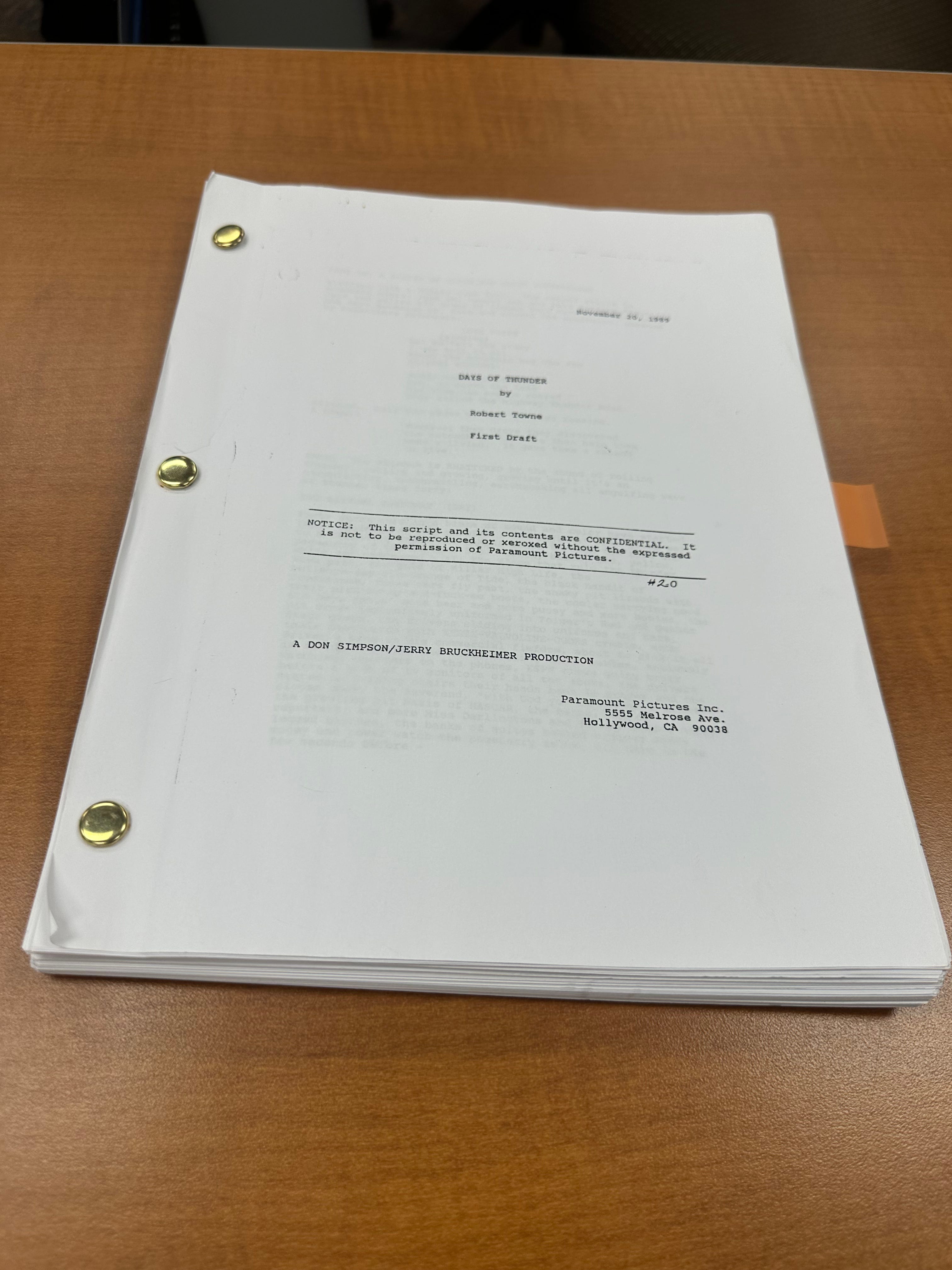 A first draft script of the movie from 1990 (the 19 hundreds as my kids like to remind me) called Days of Thunder staring Tom Cruise.